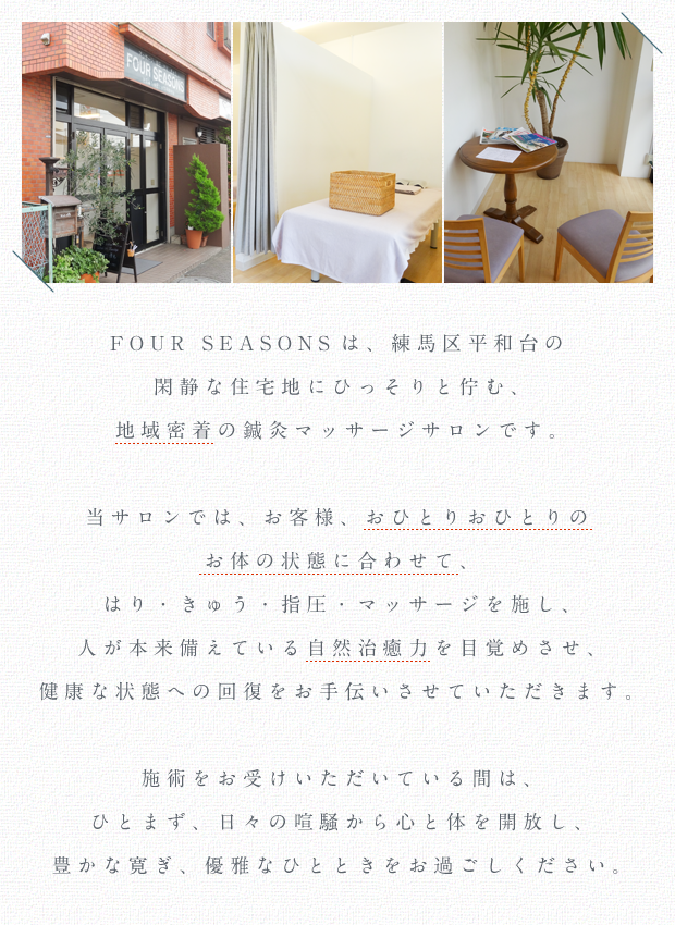 FOUR SEASONSは練馬区保健所に登録されている鍼灸マッサージサロンです(登録施術所名は「池田鍼灸指圧治療院」となっております)。